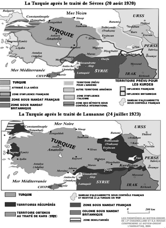 Sous l’empire ottoman, il existait une région du Kurdistan. Les Kurdes seraient entre 30 et 40 millions selon les estimations, répartis sur un espace de la taille de la France, à l’ intersection des frontières de quatre États-nations : l’ Irak, l’ Iran, la Syrie et la Turquie. Autour de 40% des Kurdes vivent en Turquie ; 25% en Iran ; 15% en Irak ; 5 à 10% en Syrie, le reste ailleurs dans le monde. Les chiffres demeurent approximatifs car les États-nations dans lesquels vivent les Kurdes ont volontairement refusé d’effectuer des comptages dans un but de négation et d’assimilation des populations kurdes. D’importantes communautés kurdes sont également installées en Russie, dans le Caucase, en Asie centrale, et après les vagues migratoires des quarante dernières années en Israël, en Amérique du Nord et en Europe occidentale (plus particulièrement en Allemagne et en France). La région du Moyen-Orient a été dessinée à la suite de l’effondrement de l’empire Ottoman, à la fin de la Première Guerre mondiale. A l’intérieur de cet empire cohabitait une kyrielle de peuples, de langues, de cultures et de religions. La chute de l’empire va réveiller les volontés de créer des États-nations. Un premier traité est signé en 1920 (le traité de Sèvres) qui prévoit, à côté d’ un État turc, la création d’un État kurde et d’un État arménien. Ce qui deviendra l’ Irak et la Syrie reste sous influence anglaise pour le premier et française pour le second. La partition ne convient à personne. Le mouvement nationaliste turc lance une guerre d’indépendance avec l’aide des Kurdes. En 1923, cette guerre remportée, les Turcs imposent une nouvelle partition validée par le traité de Lausanne. La Turquie est née. Elle trahit ses alliés kurdes et efface l’État kurde, elle en fait de même avec les Arméniens, déjà victimes d’un génocide en 1915. Ces derniers négocient alors avec l’ URSS la création d’un État à l’ intérieur de l’Union soviétique. Les Kurdes sont eux écartelés entre la Turquie naissante, le mandat français en Syrie qui récupère les terres du sud-ouest du Kurdistan et le mandat anglais qu’est l’Irak.
